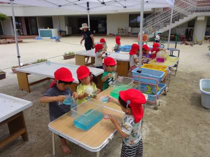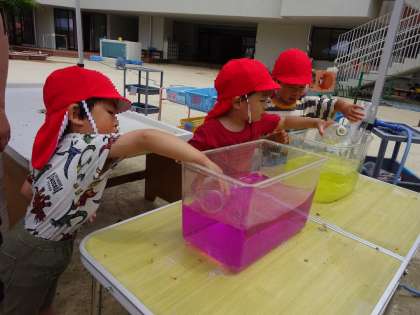 昼からは、色水を用意し3歳児でジュースづくりをしました。