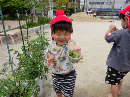 幼稚園には、ミントの葉がたくさん生えていますが、年長のお兄さんお姉さんがやっていた様子を真似しながらつくっている子もいました。