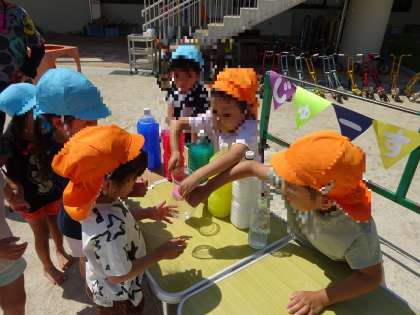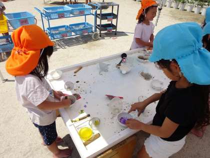 一方で、草花を使って色水づくり。手やすりこぎ、茶こしなど様々な方法で色をつくることを楽しんでいます。
