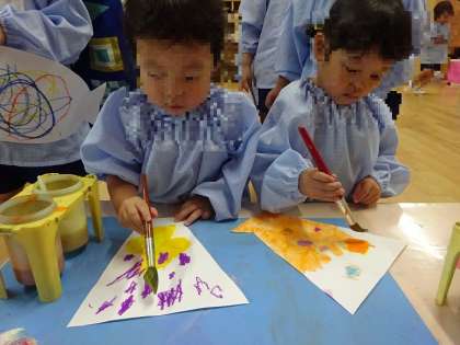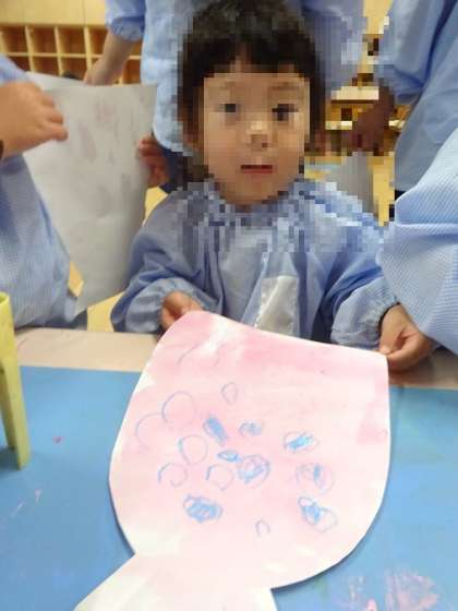 降園時に、一人一人何のジュースにしたか聞いてみると「バナナジュース」「レモンジュース」(黄色)「イチゴジュース」「サクランボジュース」(赤色)など、同じ色でも、いろいろなジュースのイメージをもって楽しんでいました。