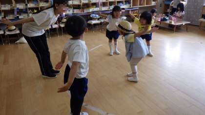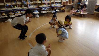 リズムに合わせてそれぞれの虫のポーズをとる体操で、どんどんスピードが速くなることが楽しさのひとつです。