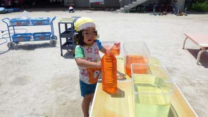 「先生見て!きれい」「こんな色になったよ」「ぶどうジュースができたよ」「ここに座ってジュース飲んでみて」と、嬉しそうにできた色水を見せに来る姿が見られました。