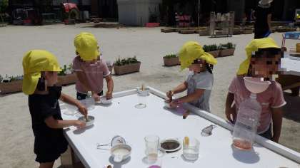 水に色がつくことが面白く、もっとつくりたいという気持ちになるとともに、色水ができるとイメージが広がり、ごっこ遊びにも広がっていっていくのですね!