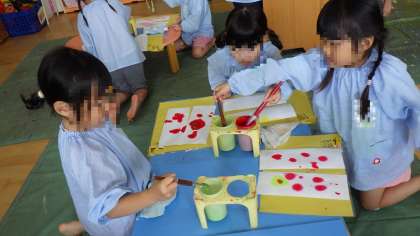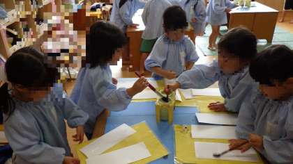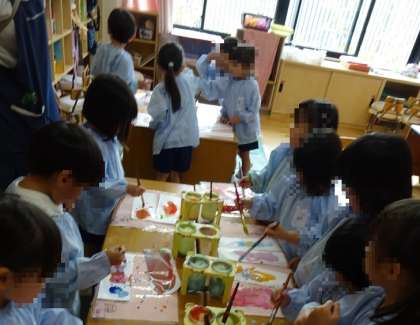 「大きくなった!(広がった)」「きれい!」「この色とこの色にしてみてん」と、色のにじみやにじんで色が混ざることを楽しんでいました。