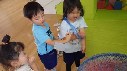 「やってみたい」と、保育室からスズランテープを持ってきて服に貼りつけたり、扇風機の前でスズランテープを持つ手を放して、飛ばしたりして遊び始めました。