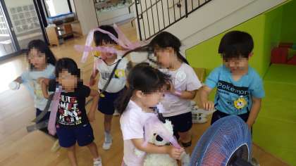 暑い中、子どもたちが室内でも遊びを楽しむことができるように、DENの前に大きな扇風機を用意しています。