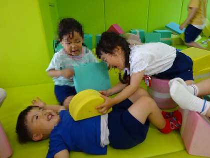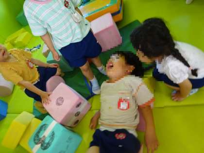 連日、内科検診や歯科検診が行われていますが、昼食後ふとDENの遊びを見てみると、ソフト積み木で診察台をつくって病院ごっこをしていました。
