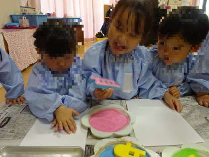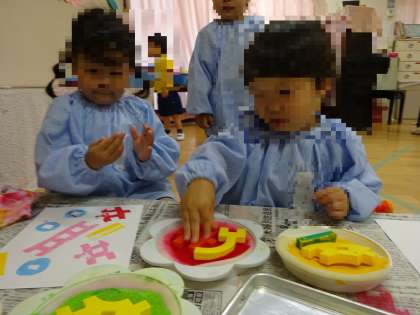 昨日は、身近なブロックを使ってスタンプ遊びをしました。