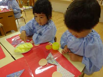 画用紙にいろいろな形のブロックをペッタンペッタン。