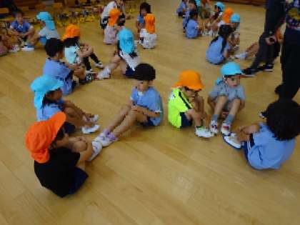 暑い中、歩いて遊びに来てくれて、遊戯室で仲良し遊びをしたり、園庭で色水遊びや泥んこ遊びを一緒にしました。
