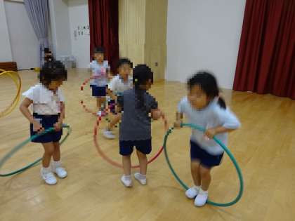 今日は遊戯室でフープ遊びをしました。