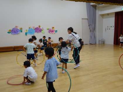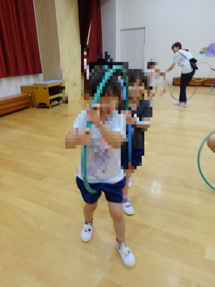 と言っている子もいて、フープでできる様々な遊びを楽しんでいました。