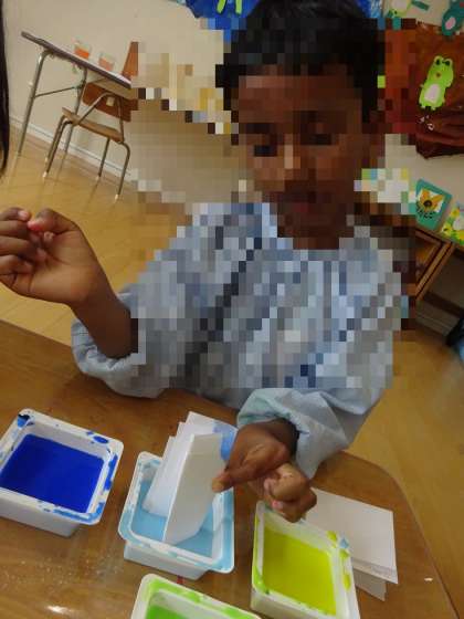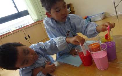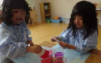 染め紙遊び(5歳児) 公開日 2025/06/23 更新日 2025/06/23 お知らせ 保育室で染め紙遊びをしました。 「どんな色になるかな?」「染めた紙を広げると、模様ができた!」と、何度も染めて遊んでいました。 今日染めた紙が何になるのか、お楽しみです! いいね(0)