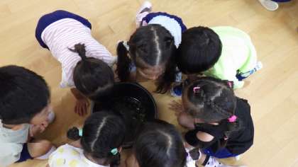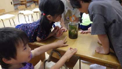 みんなで観察すると「ちっちゃい!」「なんかキラキラしてる」「目が黒いのがいる!」と気付いたことを話してくれました。さっそく本で調べている子もいましたよ!