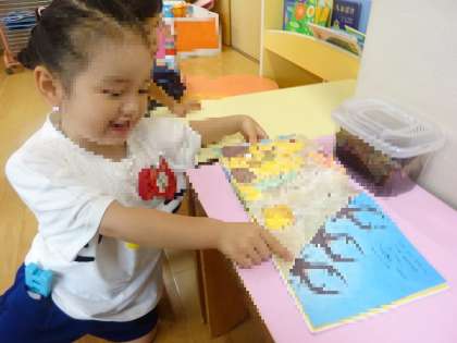 カブトムシの前で絵本を見ながら「あれ、この子(メス)いない」「この子ツノないね」と発見したことを友達同士で話していました。