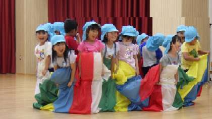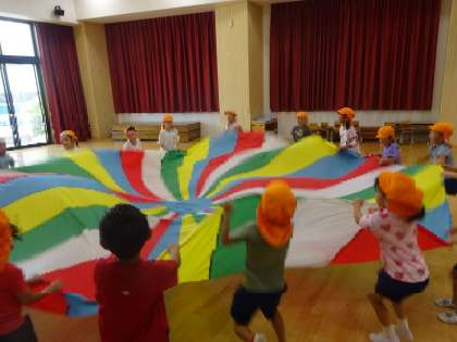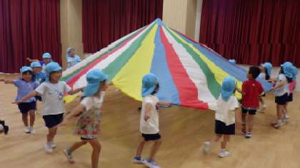 そら組、つき組で音楽をかけながらパラバルーンで遊びました。