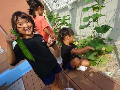 幼稚園の2階ウッドデッキに、年長児が育てているキュウリがなり始めています。