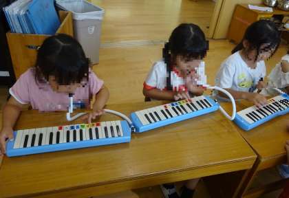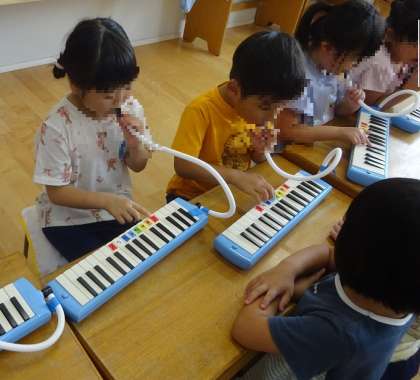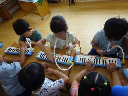 鍵盤ハーモニカでで遊びました(5歳児) 公開日 2025/07/10 更新日 2025/07/10 お知らせ 年中児の時に進級記念品でもらったふき口を使って鍵盤ハーモニカをしました。日頃の遊びからピアノや電子ピアノを使って探り弾きをして遊んでいます。 息を吹いて音を出すということが新鮮で、新しい楽器に関心をもっていました。いつでも遊べるように環境を用意しておこうと思います。 いいね(0)