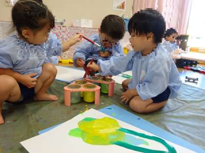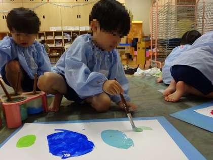「できたー!」「色混ざってきれいになってん♪」と色の混ざり具合も感じている様子のいちご組の子どもたちでした。