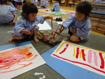 始める前に、筆についた絵の具が落ちないように使い方を知らせると「ポタポタしない!」と絵の具が落ちないことに驚いていました。