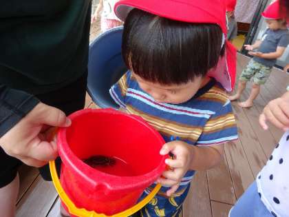 後から出てきたいちご組の友達も、興味津々にじっと見つめていました。