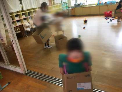 4歳児(ゆき組)は、段ボールを電車にすることをイメージしたようです。子どもたちのつぶやきを聞き、子どもたちのやりたい遊びを展開することで子どもたちは主体的に遊び出します。さらにアイデアを出しどんどん遊びを作っていきます!この後友達と一緒に乗って遊んでいました!
