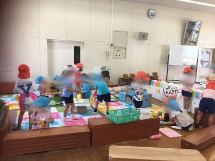 「これで遊びたい!」という気持ちをすぐに実現できるコーナーです。友達と相談しながら作ったり、自分のイメージでコツコツと作ったり、また布ガムテープに苦労したり、、様々な姿がありますが、みんな自分でやりたいことを楽しんでいる姿です。