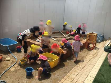 今日は暑いので3歳児、4歳児が砂場で水を使って遊んでいます。最初は水を使わず足の裏で砂の感触を楽しんでいた子どもたち。少しずつ段階を踏んで水遊びに移行しています。このような感触遊びを大切にしています。