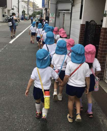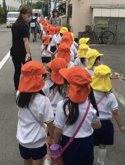 来週、電車に乗って園外保育に出かける前に歩く練習を兼ねて公園に出発です!道の端を上手に歩いています。公園でも、滑り台やブランコなど楽しく遊びました。