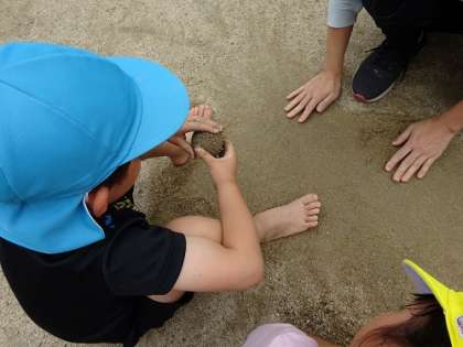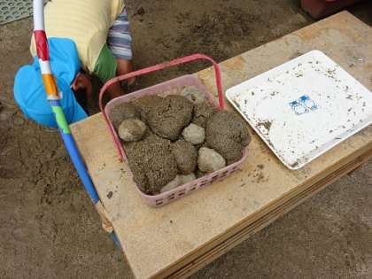 園庭では、水遊びや泥遊びなど存分に遊んでいます。裸足になって泥の感触を味わい、集中して泥団子を作り、お店屋さんごっこに発展しています。幼稚園ではこのような遊びを大切にしています。