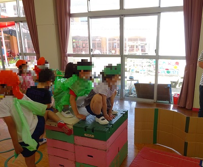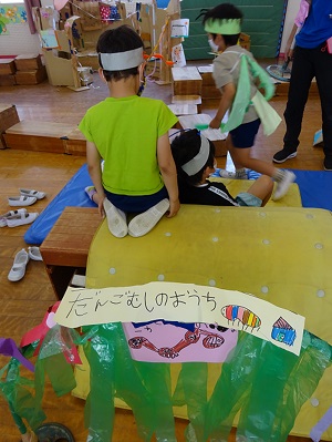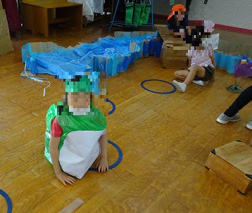 絵本のわんぱくだんシリーズが大好きな子どもたちが、たんけんごっこを楽しんでいます。ダンゴムシになったり、カエルになってジャンプしたり、それぞれのイメージで楽しんでいます。また、自分のイメージしたものをすぐに作って表現できるように『作るコーナー』もあります。作って遊び、違うものに変身し、また作って遊び…。繰り返して遊びながら、イメージを広げ、どんどん発展しています。