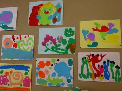 午前中プールで遊び、午後から絵の具で自由に絵をかいて遊んだり、作って遊んだり、幼稚園の一日は楽しいことがたくさんあります。決められた絵を描くのではなく、子どもたちが描きたいことを存分に表現します。ザリガニやオタマジャクシ、カタツムリなど子どもたちの生活がそのまま出てきます。色もとっても素敵ですね!