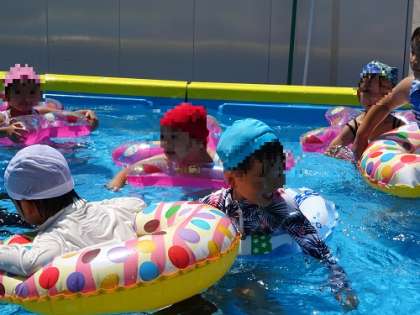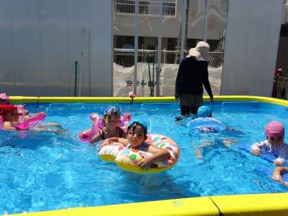 本日もプール日和です。5歳児が存分にプール遊びをしています。とても気持ちよさそうです!