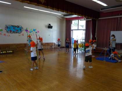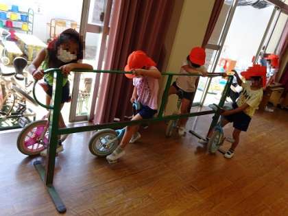 外ではなかなか暑くて一輪車など根気が続かないので、遊戯室で遊べるように設定しています。クーラーのきいた室内で根気強く、自分の目標にチャレンジしてます。5歳になると自分で目標を決めて遊べるようになります。それは見通しをもって「できるようになりたい」と思えるからです。その気持ちが持続するように環境設定しています。