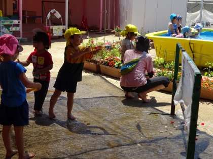3歳児・4歳児は園庭で水でっぽう遊びをしています。寒冷紗(日除け)の下で存分に水遊びを楽しんでいます。裸足になり、勢いよく水でっぽうすることはとても難しいです。まず、水でっぽうに水を入れることに子どもたちは悩みます。そして、的を絞って水をかける右手と左手のバランスがまた、難しいのです。そのバランスを取りながら何度も遊びます。遊び一つにも意味があり、先生たちはその子どもたち自身の悩みや気づきを見守り、できたときに、「楽しいね!」と共感し、一緒に遊びを広げていきます。