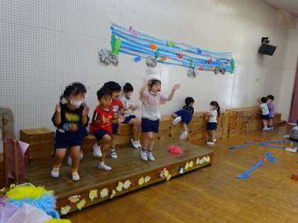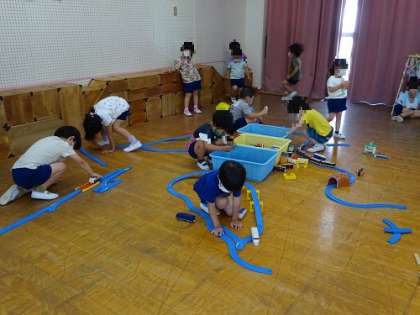 今日もとてもいい天気です。プールが気持ちよさそうです。感染対策のため分散していますが、他の子どもたちは遊戯室でそれぞれ遊んでいます。ダンスをしたり、プラレールで遊んだりすることも楽しいですね!