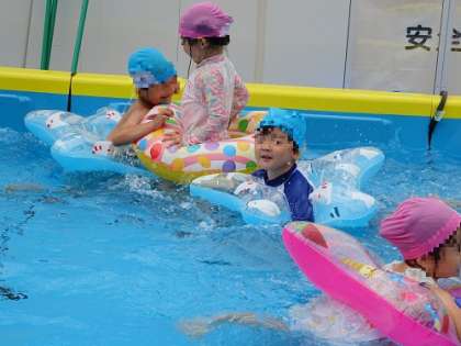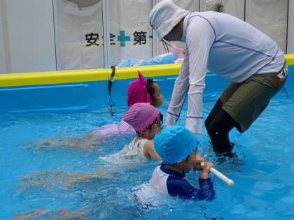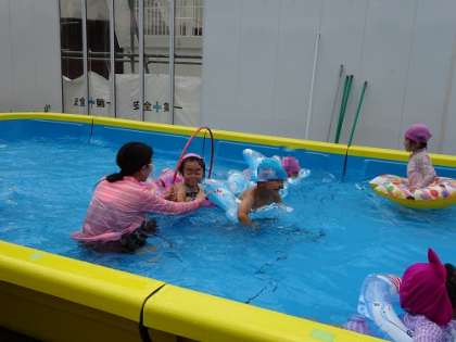 今日は3・4歳児がプール遊びの日です。プールが不安で泣いてしまう3歳児もいましたが、子どもたちの気持ちに寄り添い、子どもの表情を見ながら、遊びを進め、傍で一緒に入って慣れるまで待ちます。笑顔になったら、少し離れて見守り「楽しかったね!」「気持ちよかったね!」と共感します。