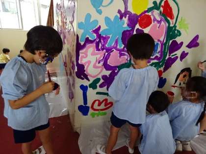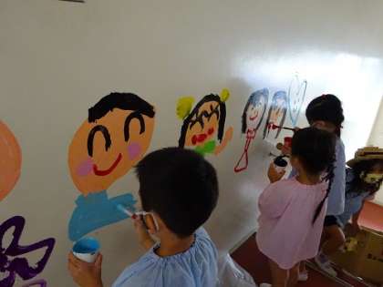 朝から5歳児が自由に壁に絵を描いています。園舎へのお別れの気持ちを込めて、楽しかったこと、好きな電車の絵など思い思いに描いています。
