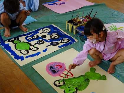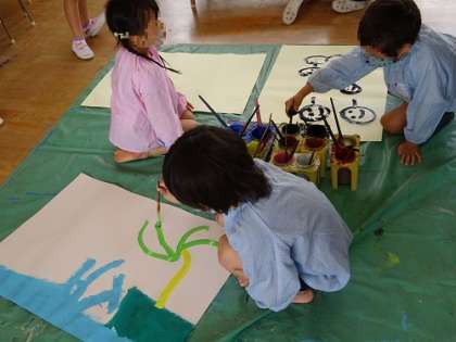 保育室で絵の具で自由に絵を描いています。子どもたちは絵画遊びが大好きです。家ではできない経験でもあるので、幼稚園では絵の具遊びをどんどん取り入れています。
