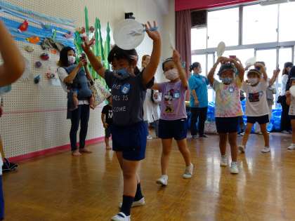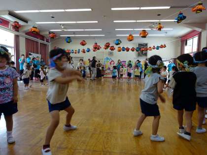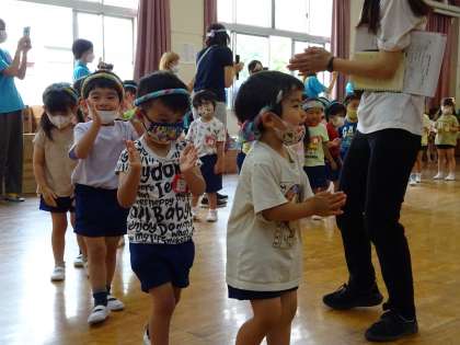 夏まつり(盆踊り) 公開日 2022/07/15 更新日 2022/07/15 お知らせ たくさんのお店で遊んだ後はみんなで盆踊りです! 事前に染めておいた手ぬぐいを頭に巻いて準備バッチリ! お迎えの時間を活用して、保護者の方にも見ていただくことができました。 「月夜のポンチャラリン」の音頭に合わせて踊る姿はとてもかわいかったです。 いいね(0)