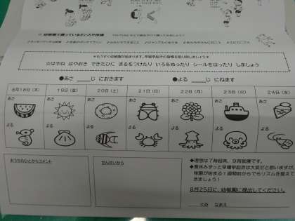 生活習慣カレンダーの、早寝早起きの色塗りも今日からです。