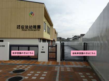 登園の際の門ですが、自転車の方は右側から、徒歩の方は左側からお入りください。