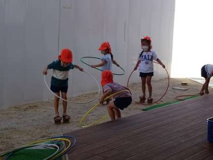 一輪車・縄跳び・鉄棒・フープなど5歳児は自分の目標を決めて取り組んでいます。