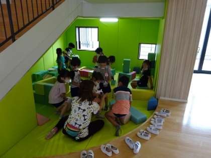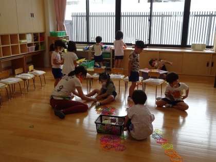 デンや保育室で遊んでいます。また、この後、遊戯室でかけっこをしていました。