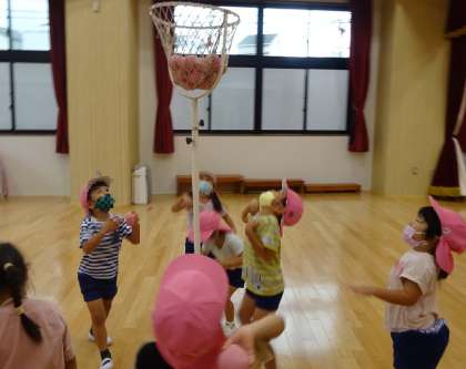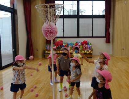玉入れ遊び(4歳児) 公開日 2022/09/01 更新日 2022/09/01 お知らせ 遊戯室にある玉入れの籠を見て、「あれ何〜?」「玉入れや〜」「やてみたい!」と声が上がりました。初めはなかなか入らず、悔しがる子もいましたが、繰り返し遊ぶうちに少しずつ入る子が出てきて、「入った!」と喜んだり、「がんばれ〜!!」と友達を応援したりする姿が見られました!「もっとやりたい!」と言っていたので、また一緒に楽しみたいと思います。 いいね(0)