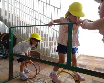 園庭では、いろいろな運動遊びに挑戦する姿がありました。「グラグラする」「難しいなぁ」と言いながらも、一生懸命漕いで前に進んでいました!