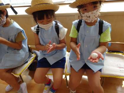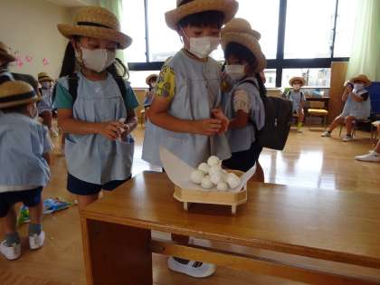 5歳児のクラスでは、「おつきさまにおそなえしようね」と、紙粘土でお団子をつくり、玄関のススキの横に飾りました。