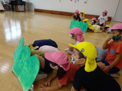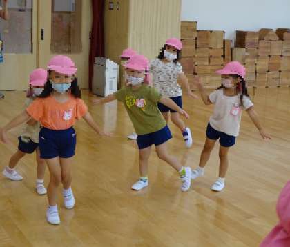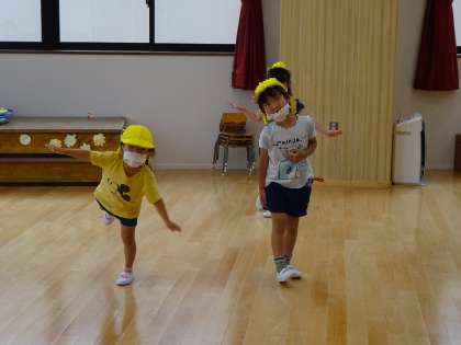 遊戯室で両手を伸ばし、トンボに変身して遊びました!「手をピンって伸ばすと、よく飛べそうだね」との教師の声かけを聞き、手も”ピン”と伸びていました。