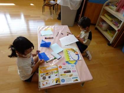 朝から作って遊ぶ子どもたちです。ハサミも自由に使って遊んでいます。もちろん1学期に使い方など指導あってのことです。