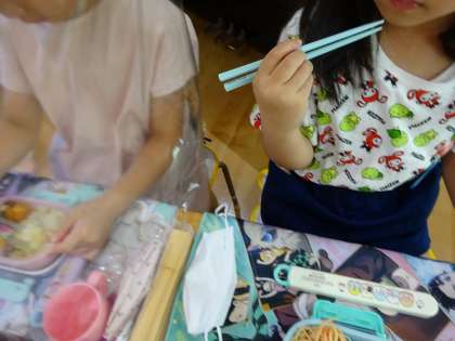 保健指導で教えてもらった「正しい箸の持ち方」に挑戦しながらお弁当を美味しくいただきました。